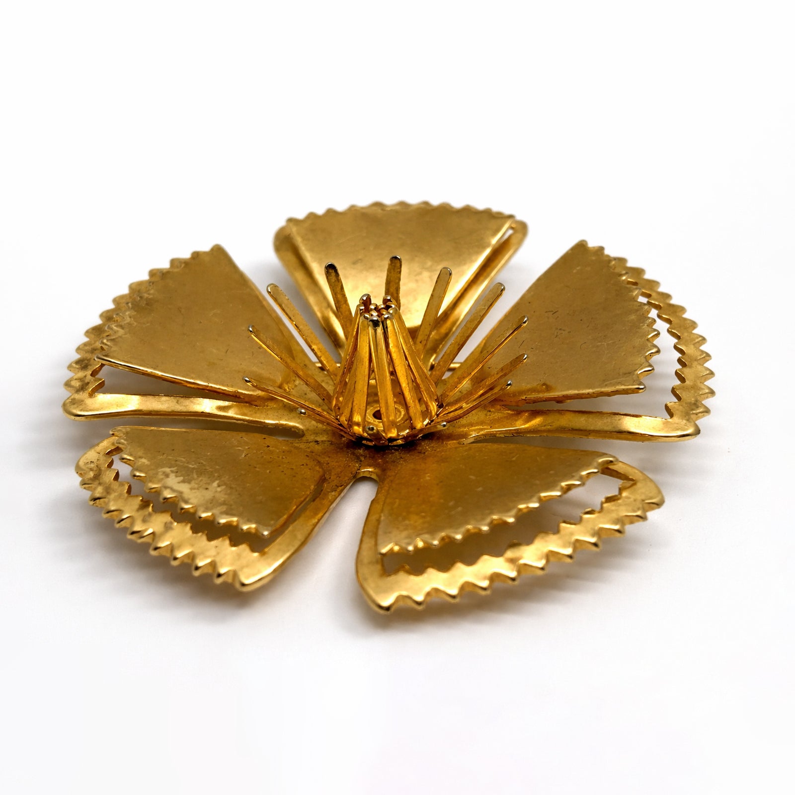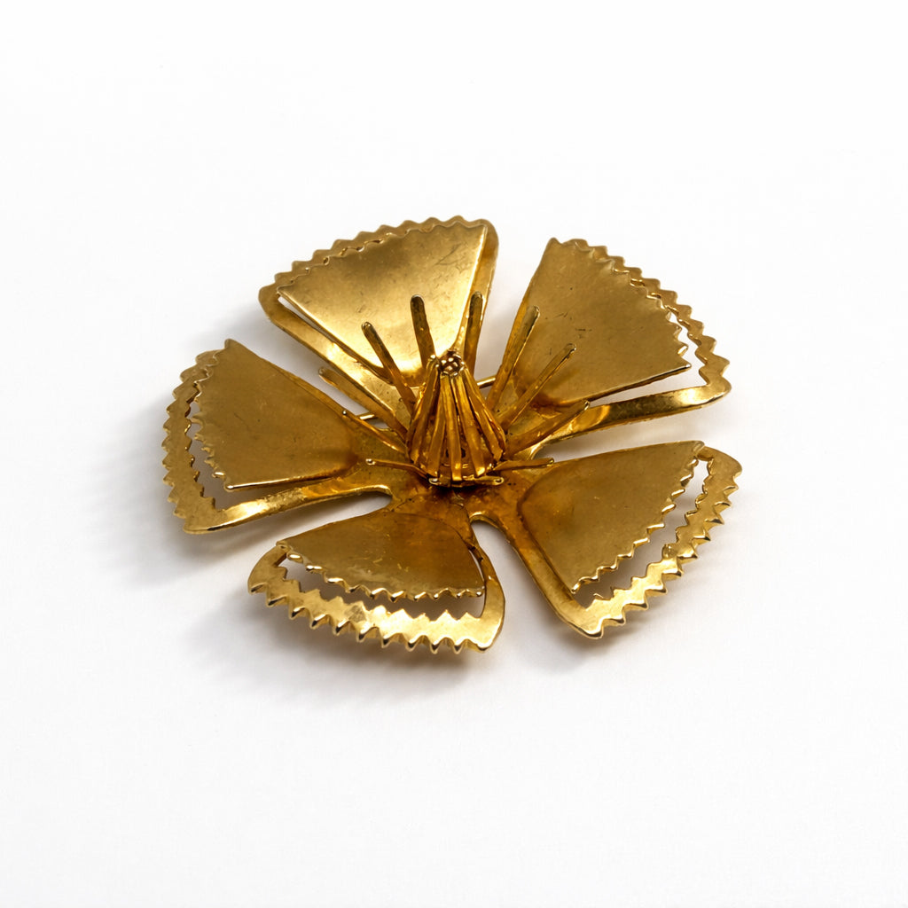 A large floral brooch from the 1960s, shaped in bold gold-tone metal.