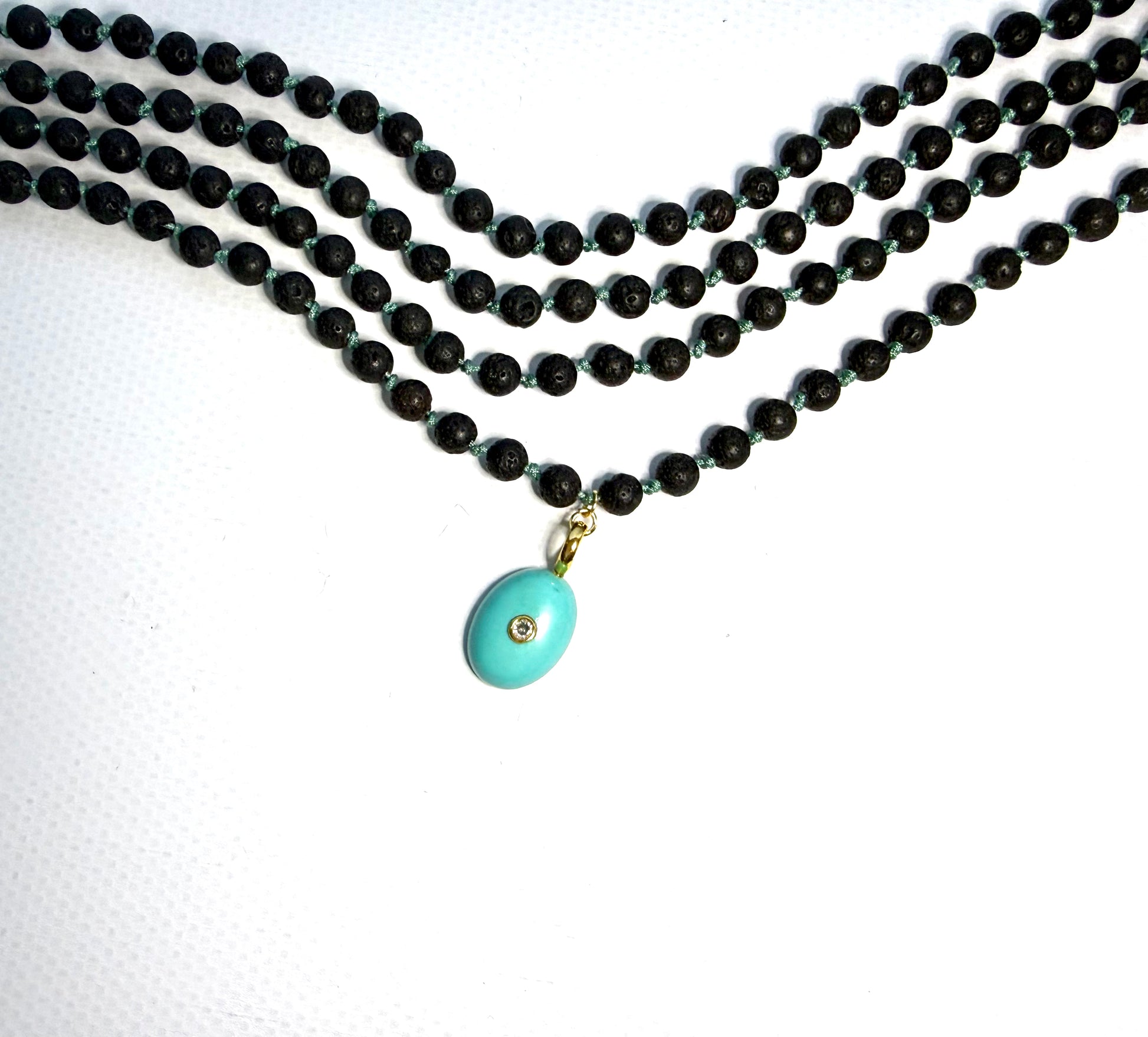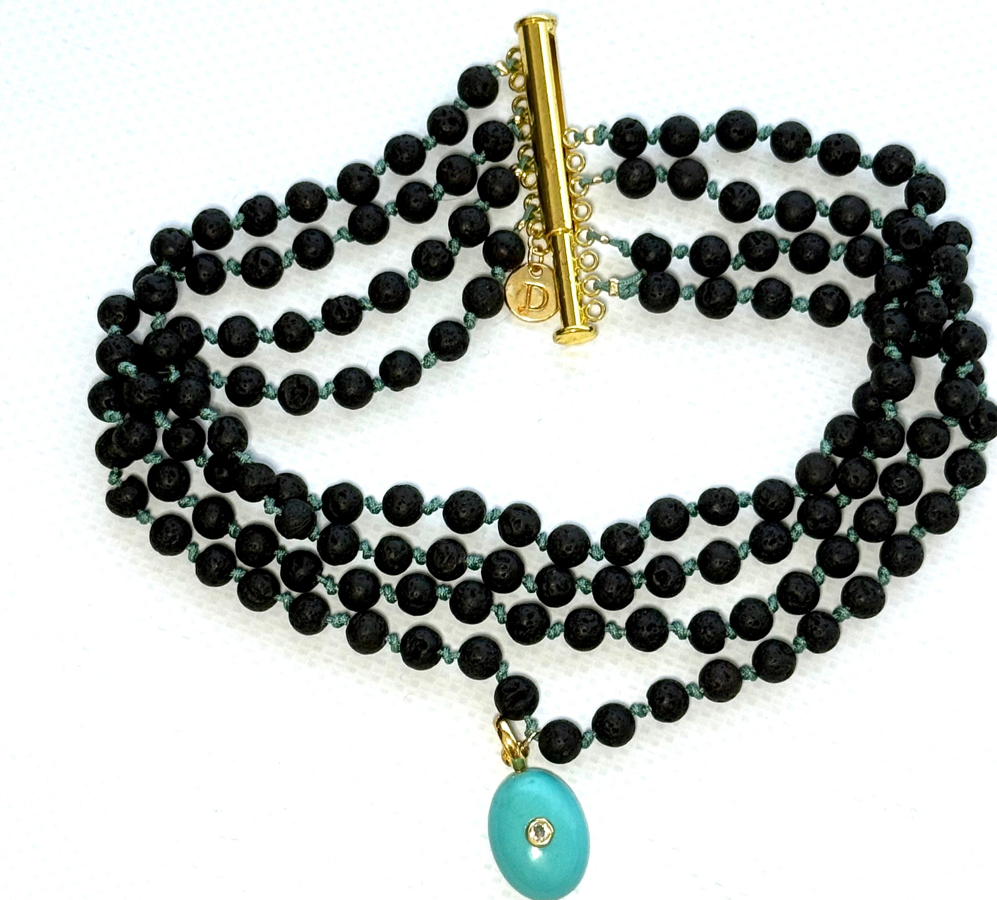This multi-strand beaded necklace is composed of matte black stone beads, gathered and structured with a gold-toned bar element and finished with a turquoise pendant accented by a single clear stone. Designed and assembled by House of Doa, the piece balances contrast and movement — dark, textured strands offset by a luminous focal drop. Subtle variations in stone texture and knotting are inherent, giving each necklace its own rhythm and character.