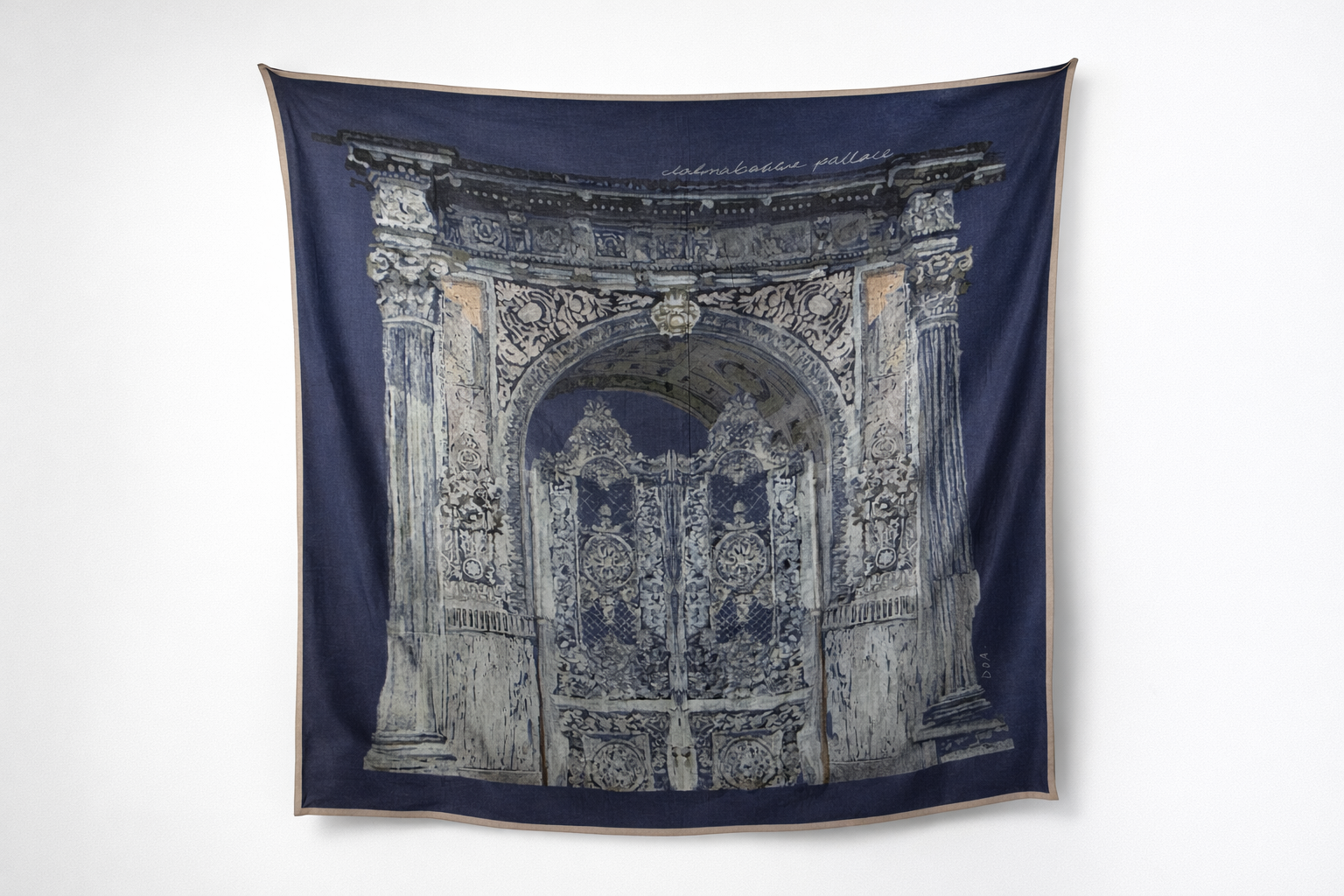 Rendered in soft, layered tones, the artwork brings together a personal love for Atatürk and the historic grandeur of Dolmabahçe, merging memory and architecture into a wearable form.