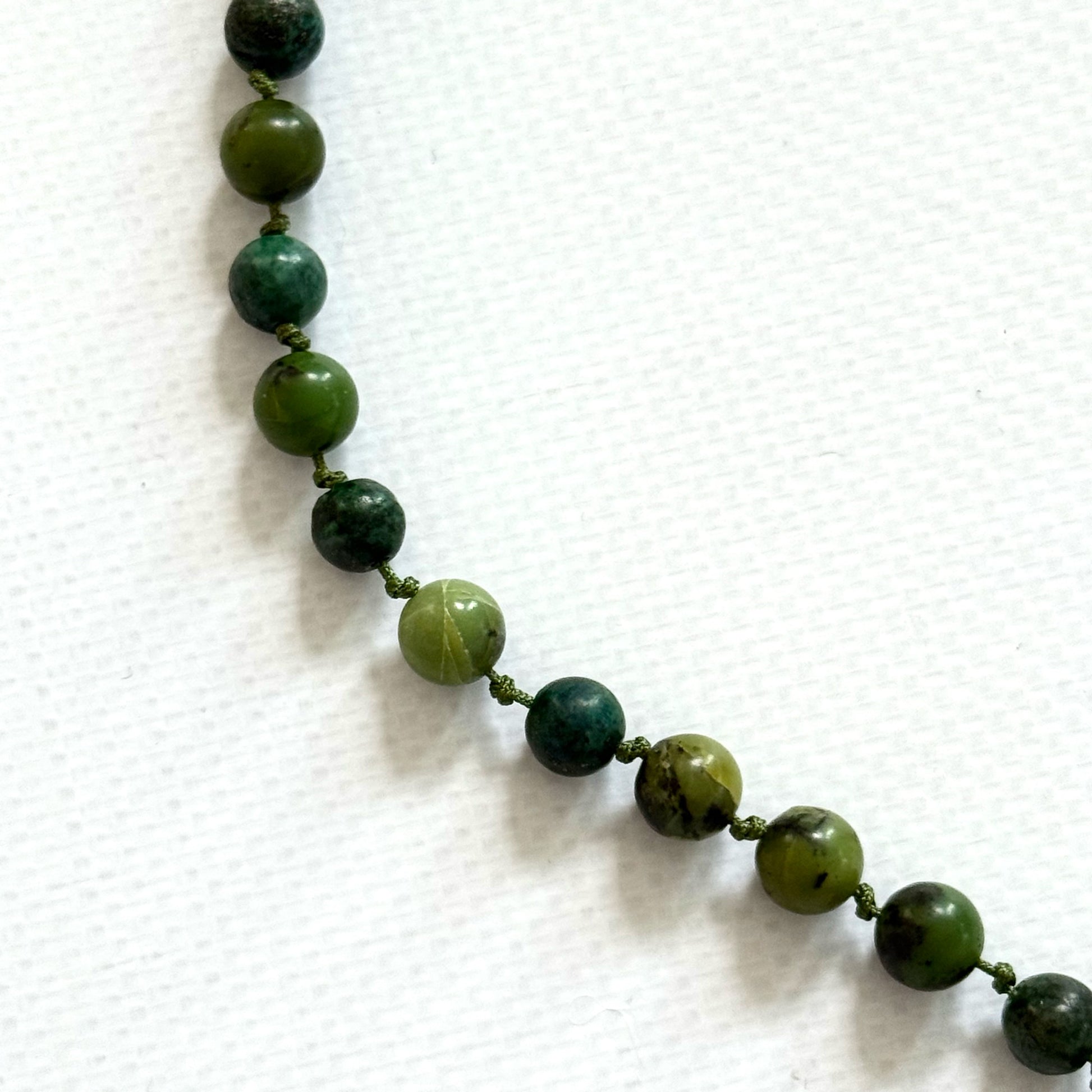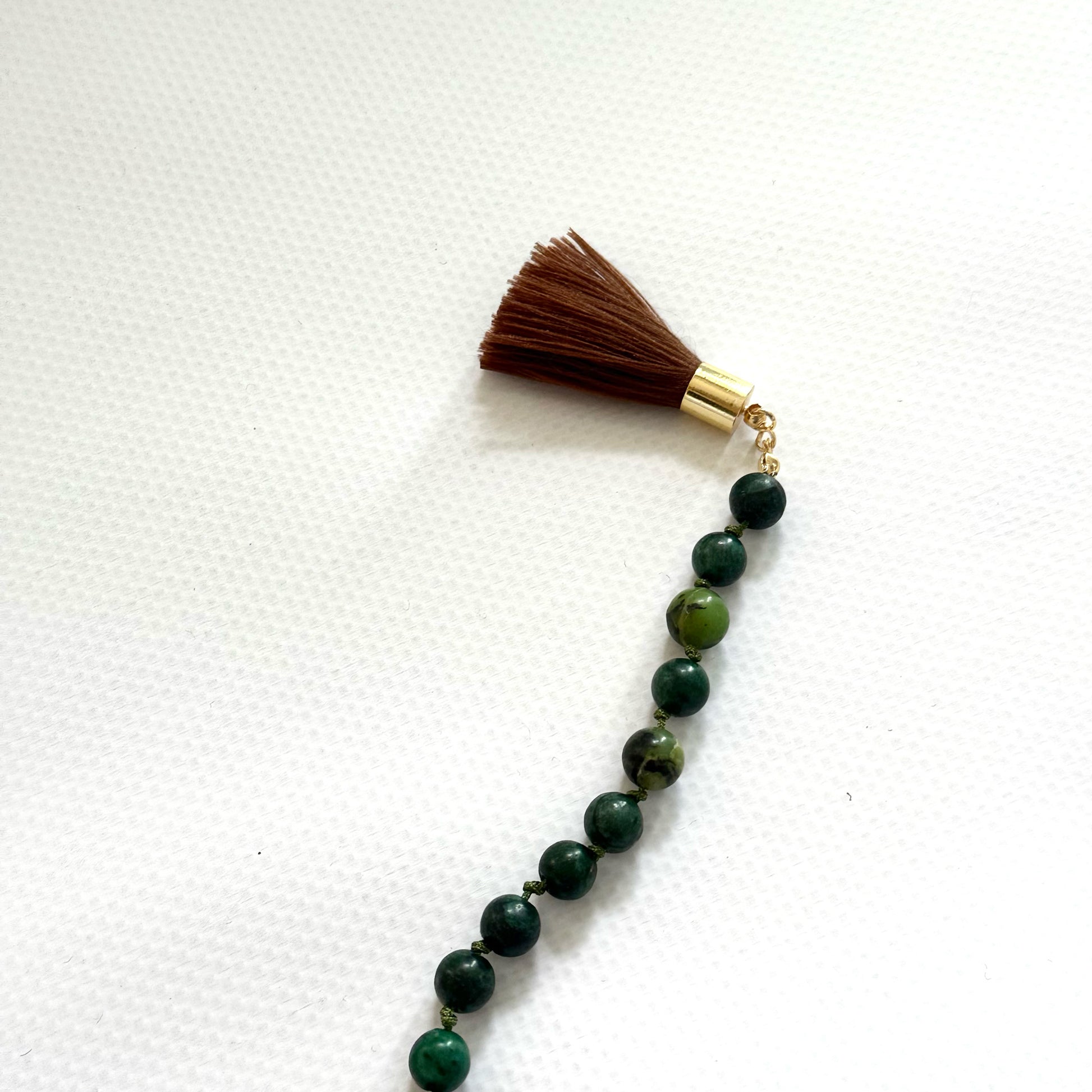 Designed to move with the body, this jade necklace rests in the front while the tassel trails quietly behind.