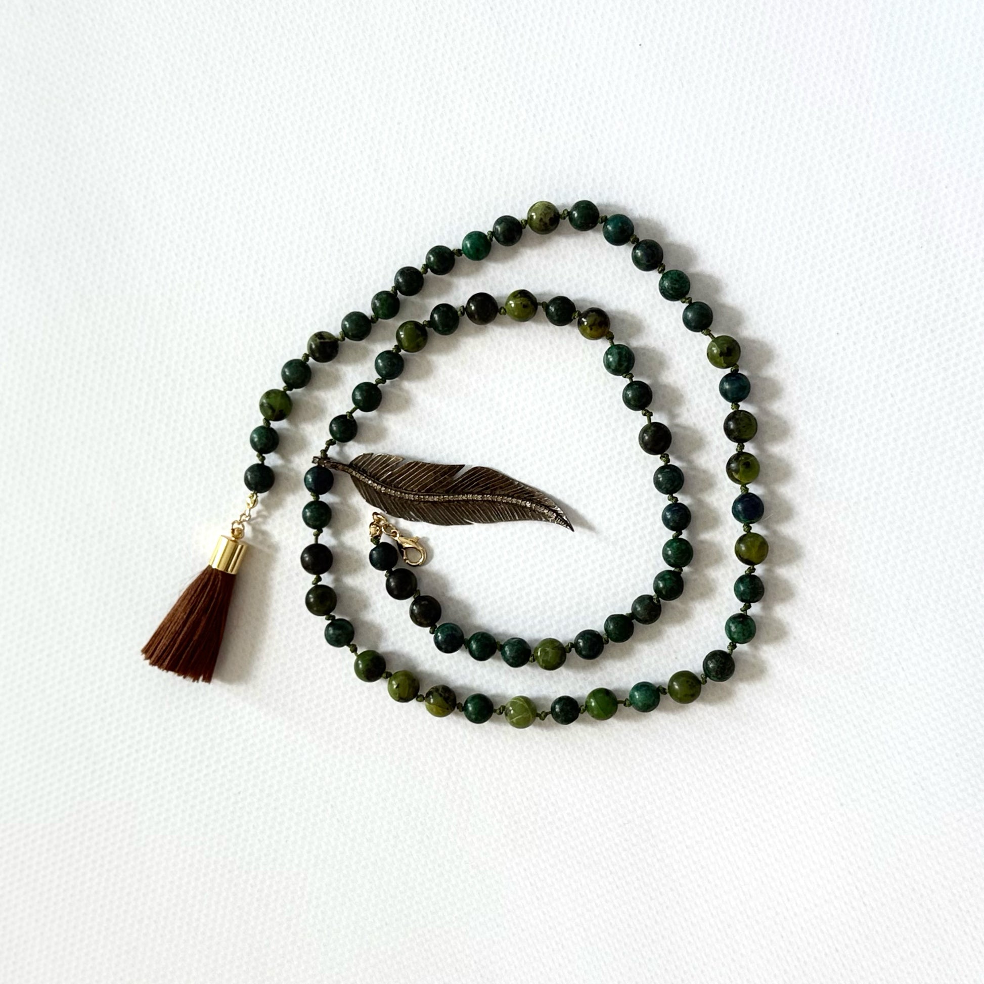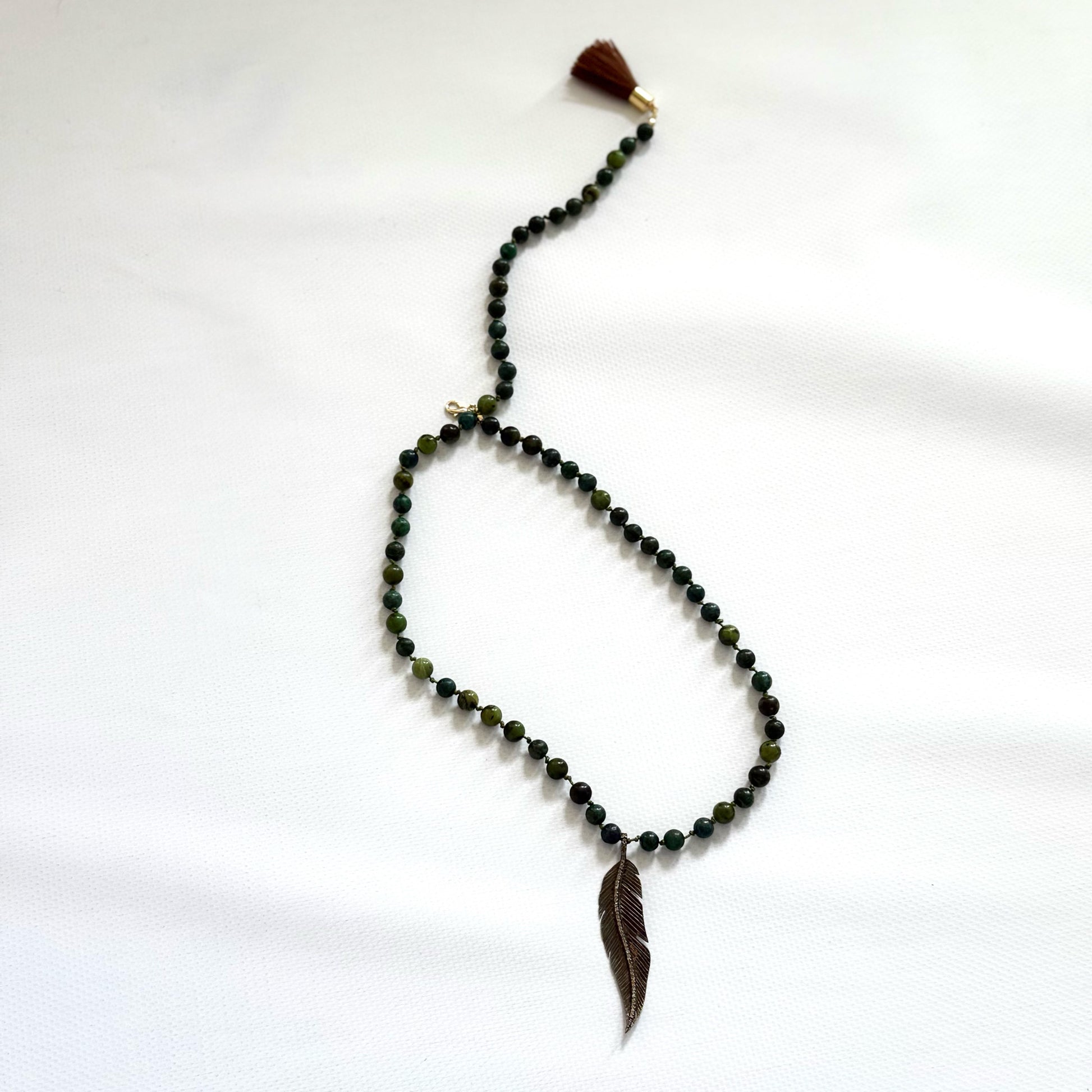 Jade stones · Silver feather charm with diamond stones · Brown Tassel