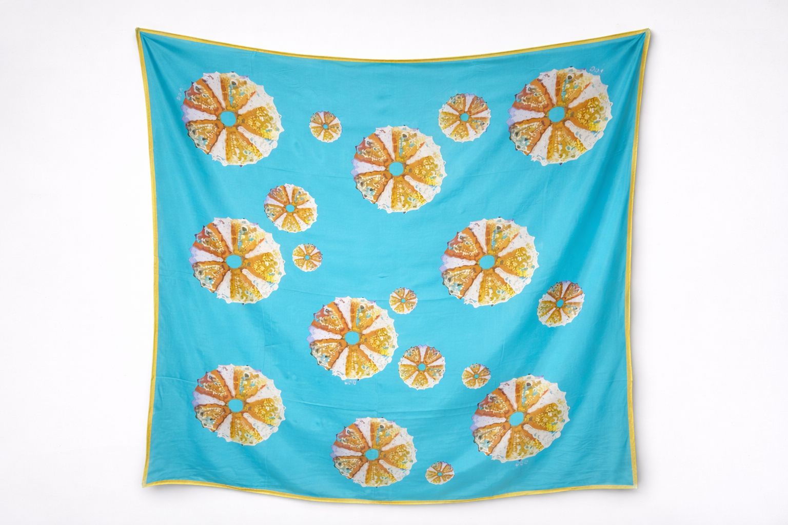 Inspired by sea urchins scattered across clear coastal waters, this design reflects a sense of lightness, movement, and playful rhythm. The repeated circular forms float across the surface, creating a composition that feels organic yet balanced.