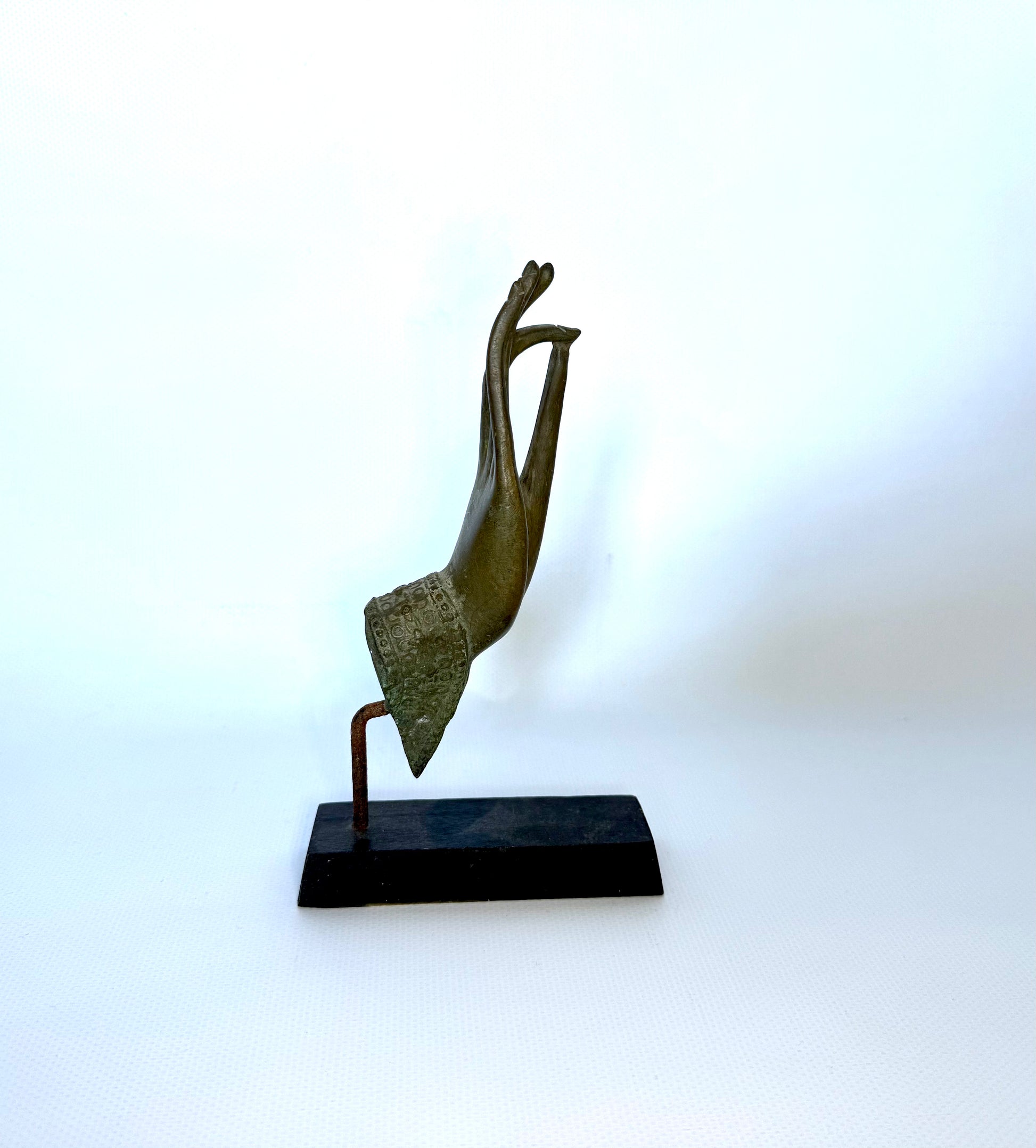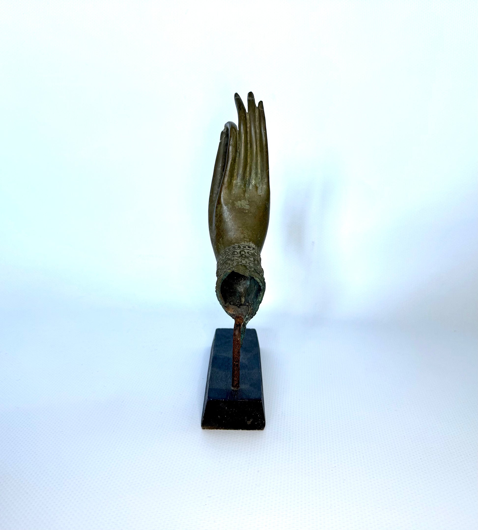This early 20th century Thai bronze Buddha hand is presented on a simple stand, emphasizing its sculptural form and expressive gesture. The elongated fingers and subtle detailing reflect traditional craftsmanship, while the aged bronze surface carries a deep, natural patina developed over time. Preserved as a fragment, the piece embodies spiritual symbolism and quiet presence, with surface wear and tonal variations embraced as part of its history, making it entirely one of a kind.