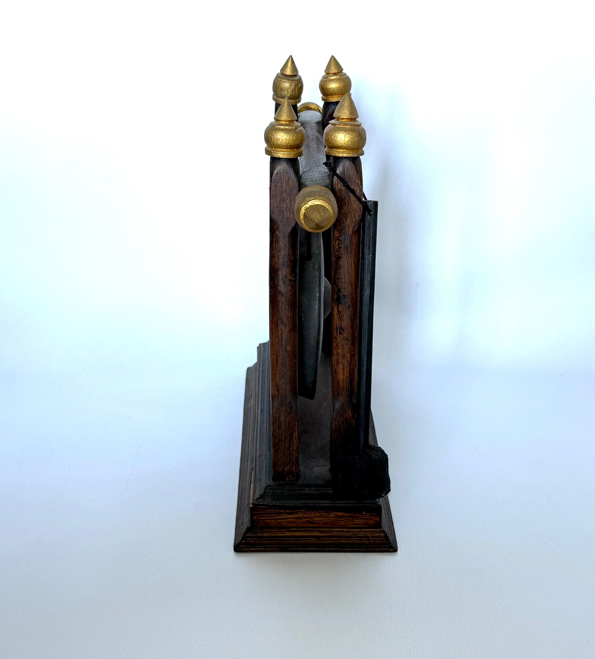This vintage Thai brass gong is suspended within a hand-finished wooden stand with subtle gilt details, forming a sculptural object with strong ceremonial presence. Traditionally used in ritual and sound, the gong carries a quiet authority even in stillness, bringing depth, rhythm, and cultural resonance into a space. Natural patina, surface marks, and tonal variations are present and embraced as part of its history, making each piece entirely one of a kind.