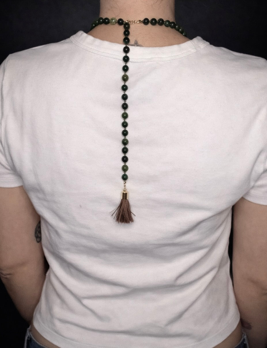 Designed to move with the body, this jade necklace rests in the front while the tassel trails quietly behind.