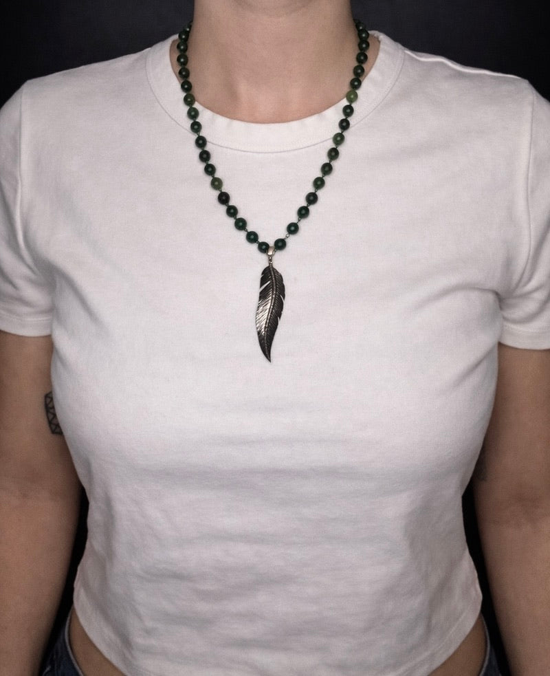 Jade stones · Silver feather charm with diamond stones · Brown Tassel